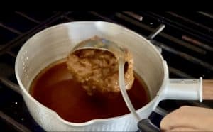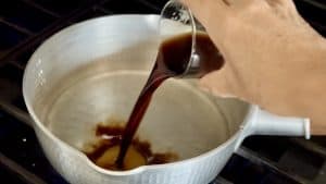 - Add 1/2 cup of water to a pot and turn on medium heat. Add 4 tbsp of mentsuyu (Japanese noodle soup base).