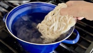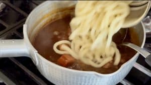 - Using dried udon: Cook the noodles according to the package instructions, then add them straight into the boiling curry. Make sure it is at a full boil before adding the udon.