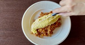 - Slice the center of the omelet lengthwise with a sharp knife, opening slowly. Then open over the rice.