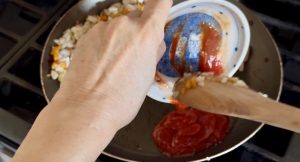 - Move the rice to one side of the pan to make a little space. Add just a bit of oil, then 3 tbsp of ketchup. Cook the ketchup briefly and mix it into the rice.
