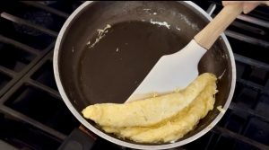 - When pushing the eggs to one side to form the omelet, a rubber spatula works best and helps prevent sticking.