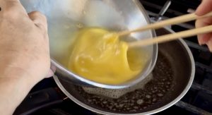 - When the butter starts bubbling, pour in the eggs. Using chopsticks, stir-constantly. When the eggs are still very soft, turn off the heat.