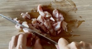 - Thinly chop onion and carrot. Cut small pieces of chicken thigh into tiny pieces.