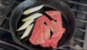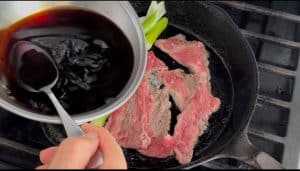 - Heat frying pan on medium-high heat. Add 1 tbsp of vegetable oil, and then a few slices of the beef. Then add white parts of leek, and leave them for 1 to 2 minutes.