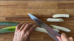 - Remove the root of Japanese leek/scallions and slice them diagonally into about 2 inch-long pieces.