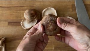 - Remove the stems from the fresh shiitake mushrooms. Make decorative cuts on the caps (optional).