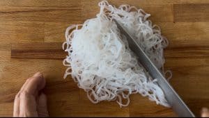 - Drain shirataki noodles in a colander. Boil them in a pot until the water has returned to boil (few minutes), then drain the noodles again. Place them on chopping board and cut into easy-to-eat lengths.