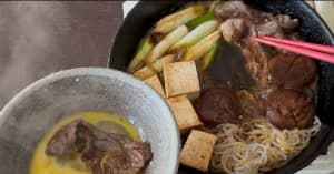 Egg Dipping: Dipping each bite in raw beaten egg is the traditional way, but only do it if you’re comfortable with the freshness of your eggs. If not, skip it—sukiyaki is still amazing with rice, beer, or sake alongside!