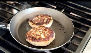 - Heat frying pan on medium high heat and add oil. Gently press the center of each patty, and add them to the pan. Let cook for 3 minutes.