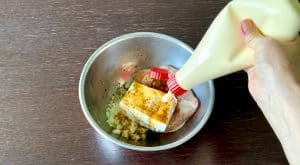 - Add 1/2 pound of ground chicken to the onion and tofu in a bowl. Add 1/4 tsp of salt and pepper, 1 tbsp each of soy sauce and mayonnaise, 3/4 tsp of sugar, and 1/2 tbsp of miso. Mix together well.